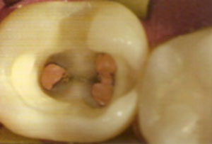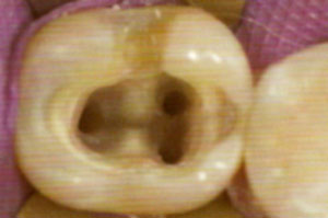 Az alsó nagyőrlő fogon jól látszanak a gyökércsatornák bemeneti nyílásai a gyökértömés előtt... |