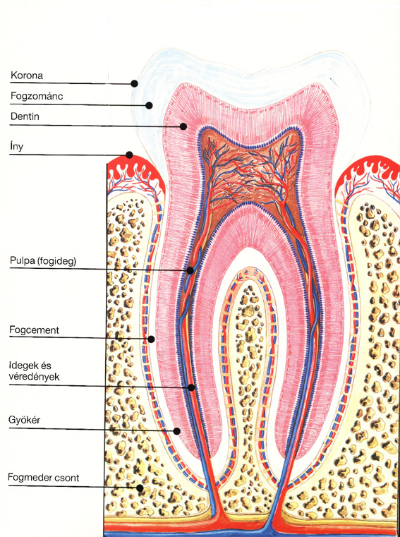 Minden fogunk koronából (az íny fölé emelkedő rész, ami szemmel is látható) és gyökérből áll, amely az állkapocsban rögzíti a fogat. A fogak nagy része egy dentin nevű anyagot is tartalmaz, amelyet sima, vékony nagyon kemény külső védőréteggel van bevonva. Ezt nevezzük zománcnak. A foggyökér felszínét a cementréteg borítja. A fogak közepében fogbél található, ami a fog táplálásáért és beidegzéséért felelős ereket és idegeket tartalmazza, valamint a fogszövet felépítéséért felelős sejteket.