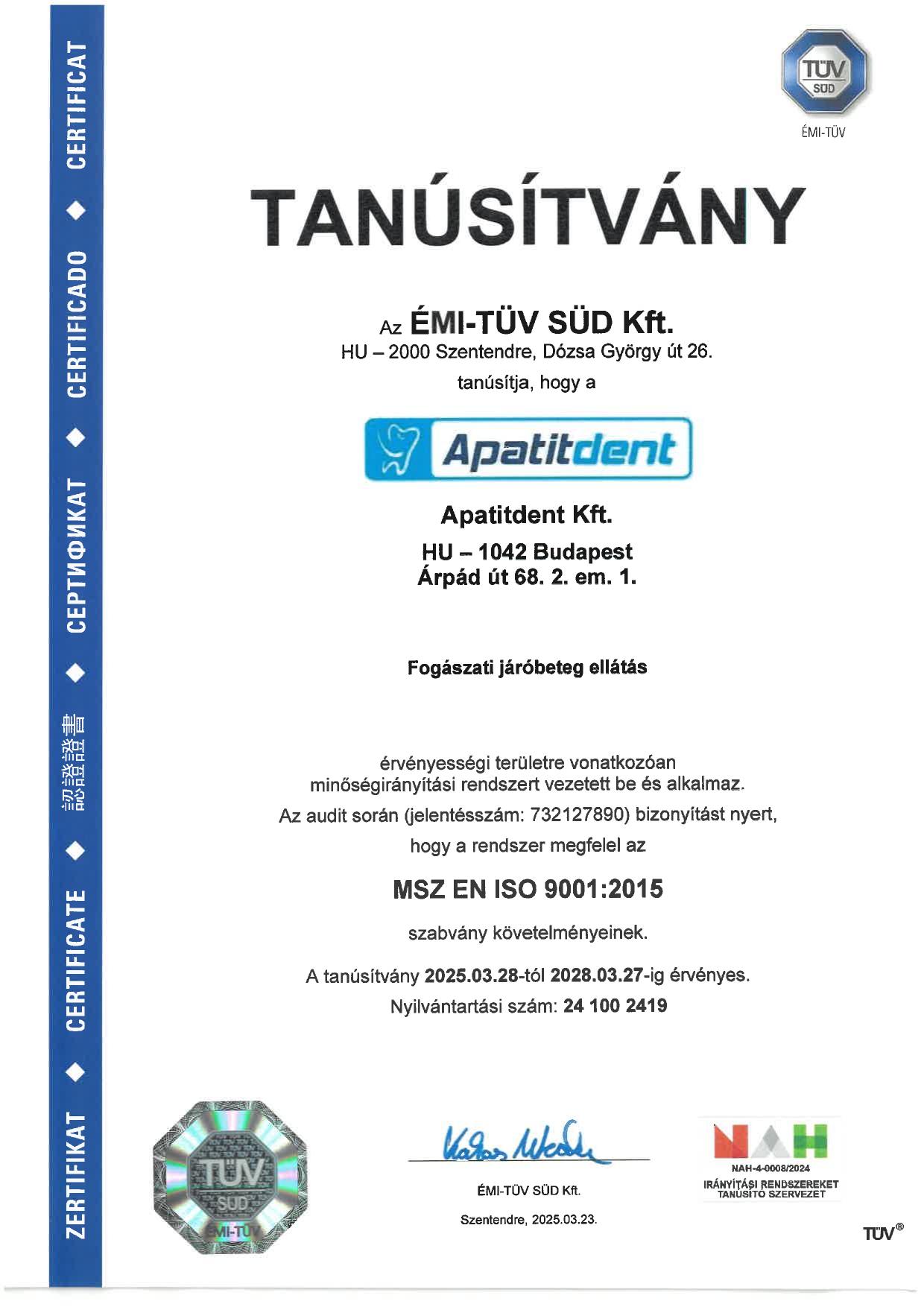 Fogászati rendelőnk kiemelt hangsújt fektet a minőségi, megbízható szolgáltatásra, a folyamatos fejlődésre, ezért kidolgoztuk, bevezettük és fenntartjuk az MSZ EN ISO 9001:2009 minőségirányítási rendszert, amelyet a az ÉMI TÜV-SÜD tanúsított.